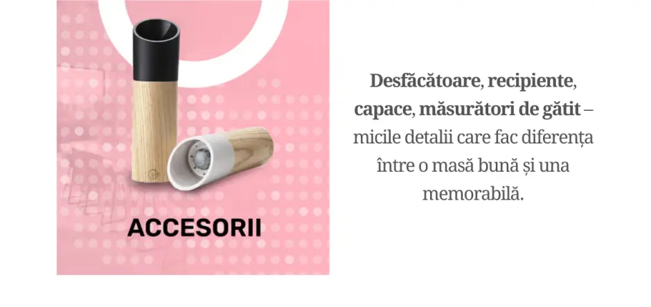 Detaliile fac diferența într-o bucătărie. Accesoriile precum suporturile pentru condimente, mănușile termorezistente sau desfăcătoarele de sticle adaugă funcționalitate și stil. De asemenea, aceste produse pot fi cadouri ideale pentru pasionații de gătit.