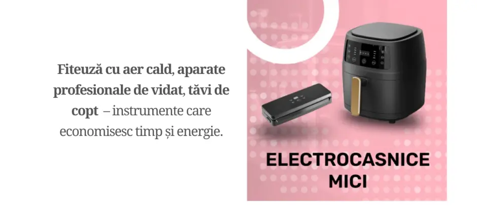 Electrocasnicele mici, precum blenderele, mixerele sau aparatele de vidat, pot transforma gătitul într-o activitate rapidă și eficientă. Koken.ro pune la dispoziție o selecție de astfel de aparate, care combină funcționalitatea cu designul modern.