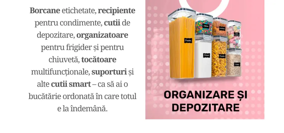O bucătărie organizată eficient îți economisește timp și reduce stresul. Koken.ro oferă soluții inteligente de depozitare, precum recipiente transparente cu capac, organizatoare pentru frigider și cutii cu divizoare detașabile. Aceste produse te ajută să păstrezi ingredientele proaspete și să ai totul la îndemână.