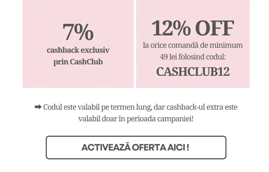 Dacă dorești să ai acces nelimitat la coduri și cupoane de reducere la peste 1000 de magazine partenere + bani înapoi la fiecare cumpărătură, creează-ți cont gratuit pe CashClub aici.
