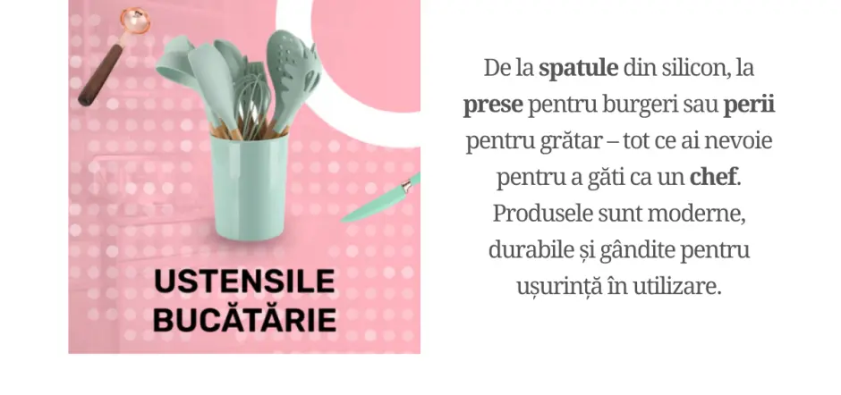 Fie că ești un bucătar amator sau un profesionist, ustensilele potrivite fac diferența. La Koken.ro găsești o gamă variată de ustensile, de la spatule și teluri, până la seturi complete care includ tocătoare și cuțite. Acestea sunt fabricate din materiale de calitate, precum silicon alimentar și lemn, asigurând durabilitate și siguranță în utilizare.