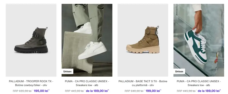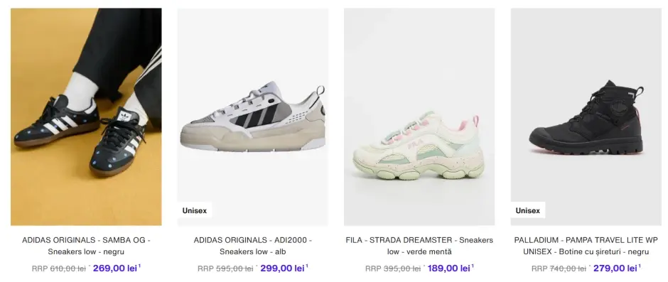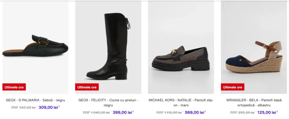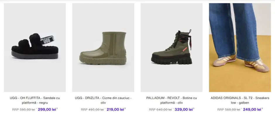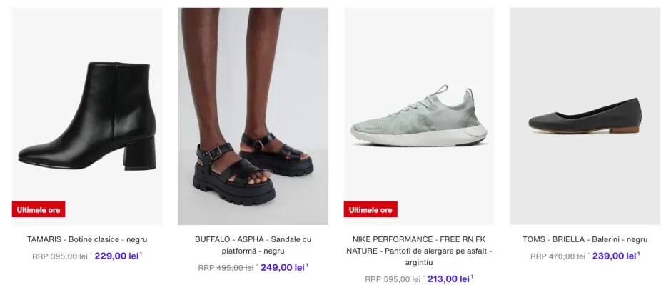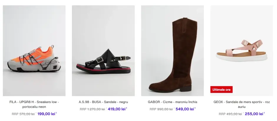 - Încălțăminte – pantofi sport, sandale, ghete și pantofi de ocazie