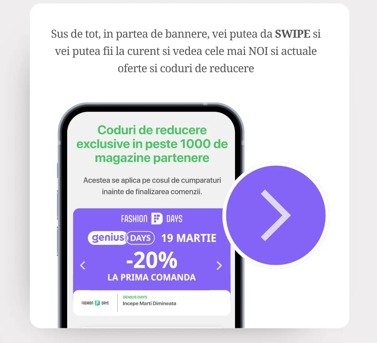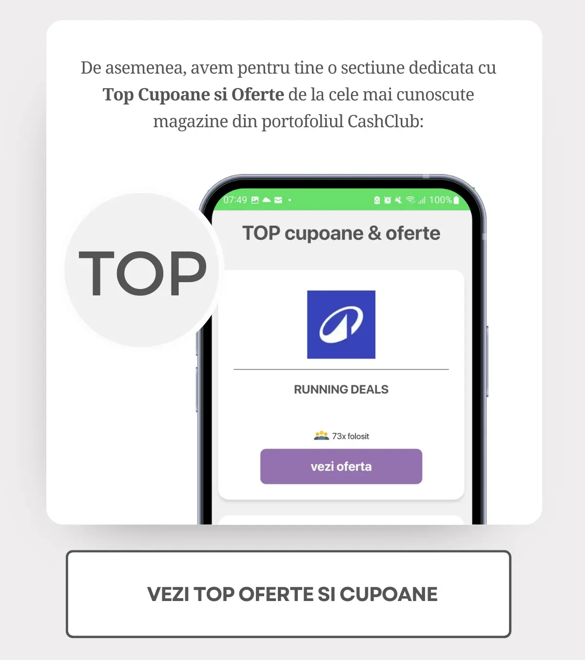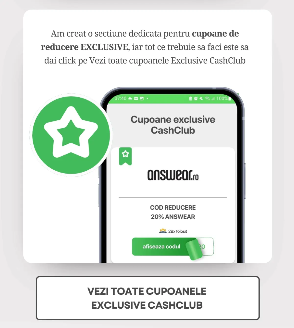 Site-urile web de cupoane si platformele de reduceri au devenit din ce in ce mai populare in randul celor care doresc sa economiseasca bani. Cu doar cateva accesari (click-uri), poti accesa o gama larga de oferte si reduceri pentru produsele si serviciile preferate. Aici, cuvantul cheie "cupoane de reducere" este la el acasa, deoarece utilizatorii il cauta activ pentru a gasi cele mai bune oferte. CashClub publica in mod regulat coduri de reducere exclusive la magazinele partenere pentru a va recompensa loialitatea, dar si pentru a va incuraja sa reveniti cu incredere pe platforma noasrta. De asemenea, va oferim oportunitatea de a urmari diverse cupoane de reducere si de a profita de acestea. Pe site veti gasi in sectiunea de coduri de reducere, atat coduri si/sau cupoane de reducere exclusive CashClub, dar si Top oferte.