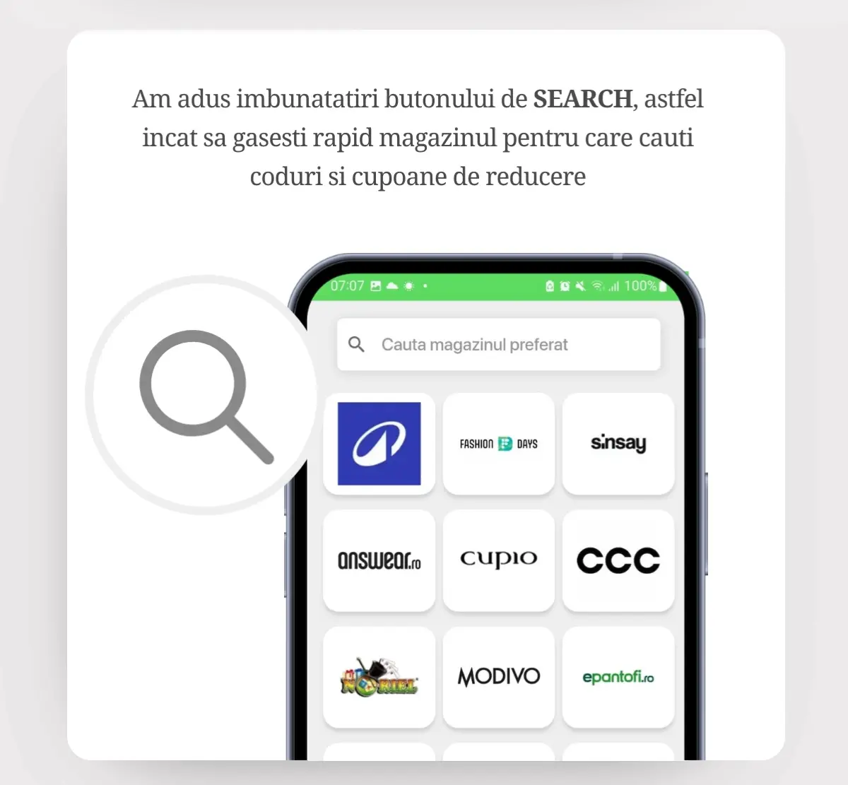 Printre cele mai populare coduri de reducere in Romania sunt cele la Emag, deoarece compania are cea mai mare deschidere la piata e-commerce din tara. Alte coduri de reducere foarte populare in Romania sunt cele la Flanco, Carturesti, Fashion Days, Noriel, Douglas, Cupio, CCC, Modivo, AboutYou, Answear, Epantofi, Sinsay, Decathlon.