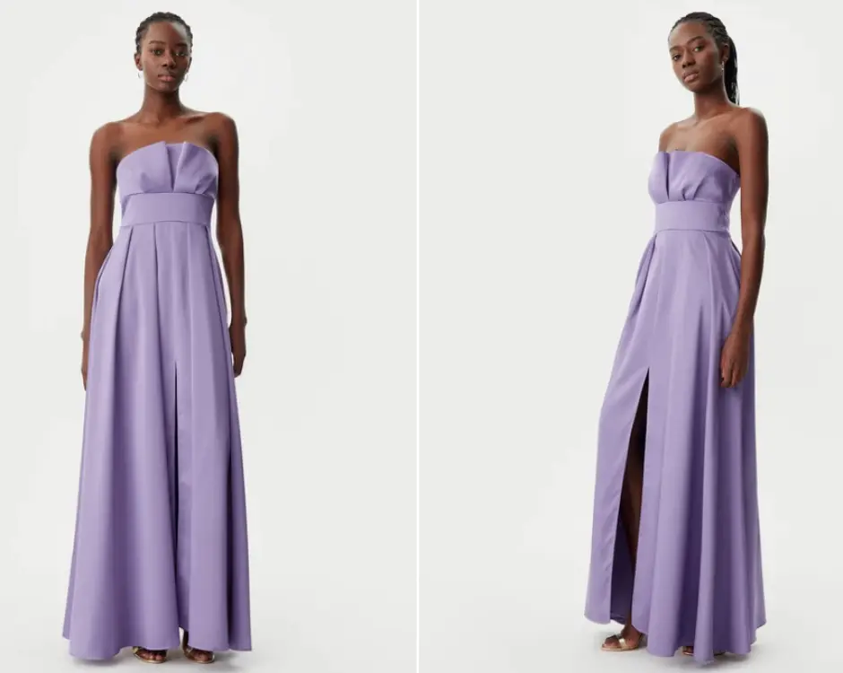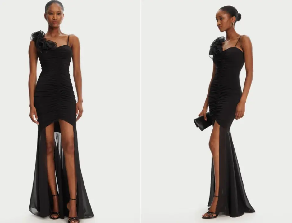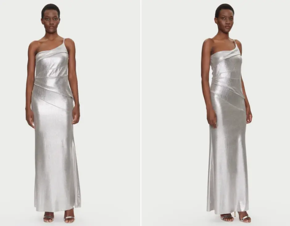 Pentru femei, rochia lungă poate depăși convenția „negru obligatoriu”. Paleta modernă include tonuri bijuterie – smarald, burgundy, safir sau chiar nuanțe sidefii de greige – atâta timp cât croiala rămâne fluidă și materialul luxos: mătase, crep dublu, catifea de mătase sau satin stretch. O siluetă tip coloana sau sirenă flatează formele fără să concureze cu bijuteriile, în timp ce un A-line dramatic, amplu, câștigă prin mișcare. Poșeta trebuie să fie diminutivă, cât să acomodeze un ruj și telefonul: clutch rigid cu închizătoare bijuterie ori plic îmbrăcat în satin.