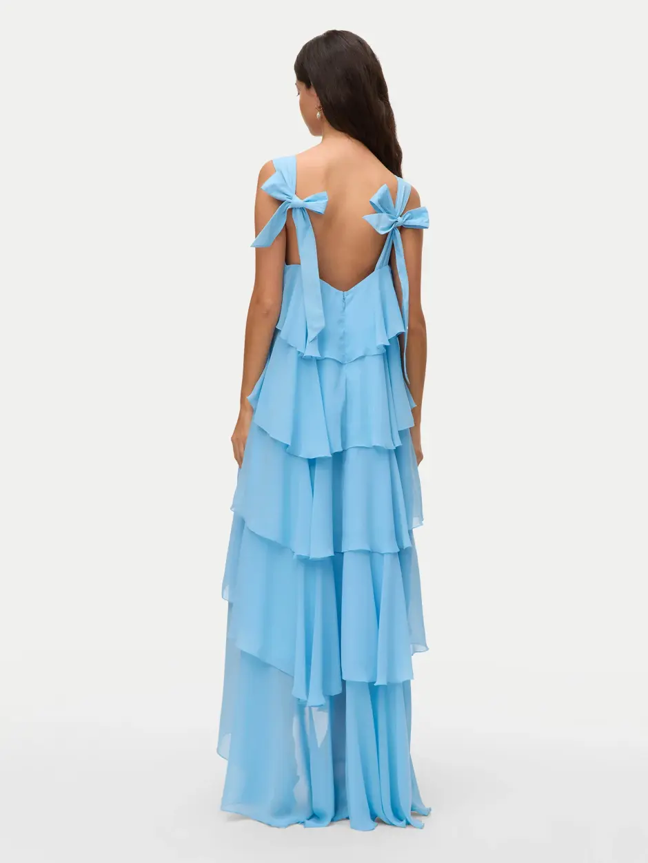Material ușor (chiffon, georgette, linen). Lungime midi. Evită tocurile subțiri care intră în pământ — optează pentru sandale cu platformă joasă sau kitten heels. O pălărie cu boruri largi sau o bentița florală completează perfect look-ul diurn.