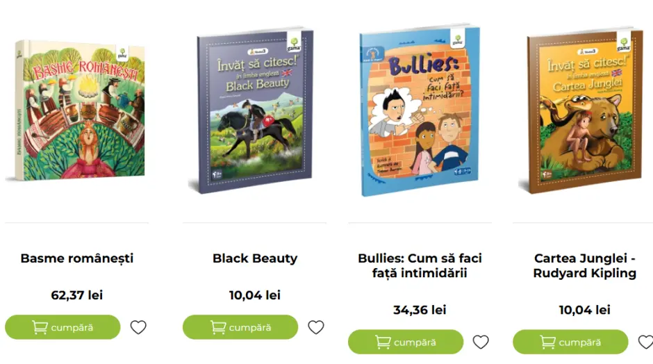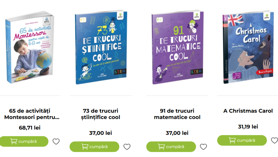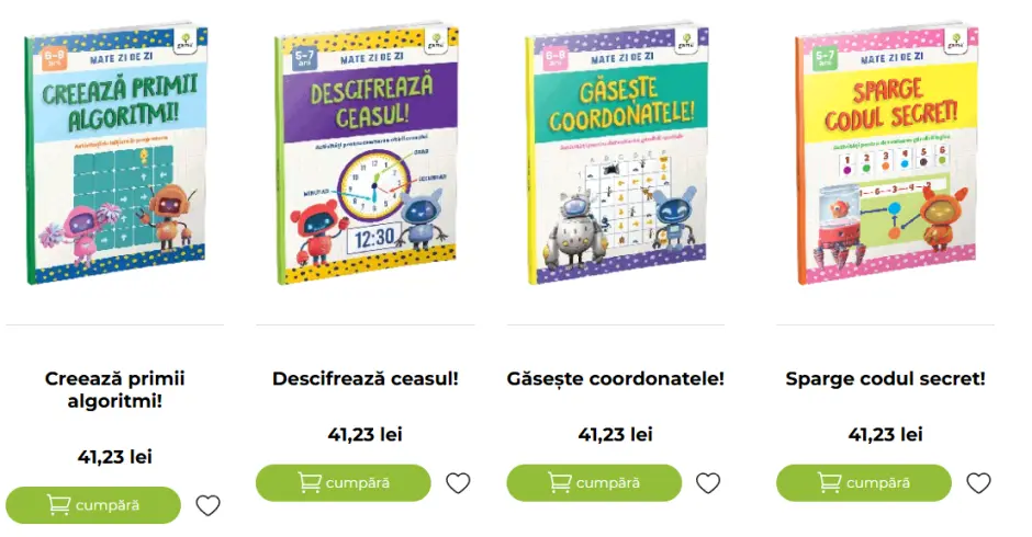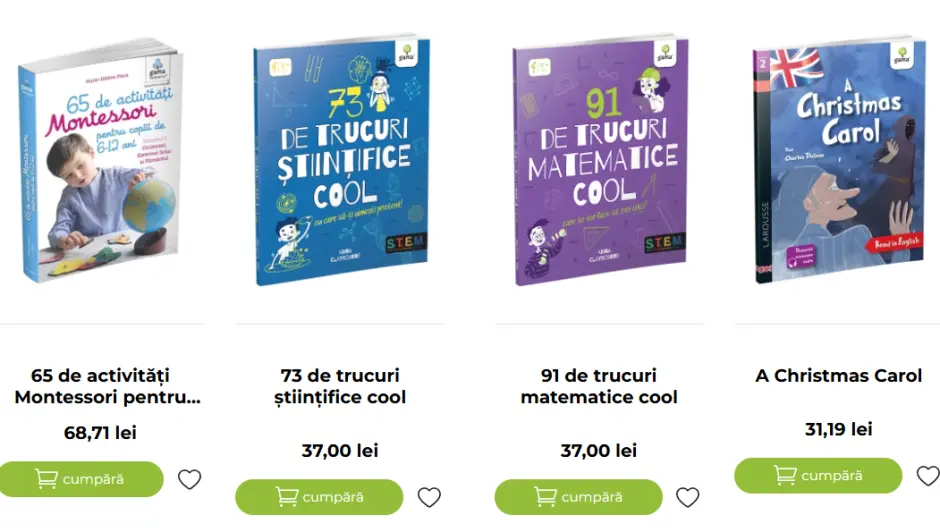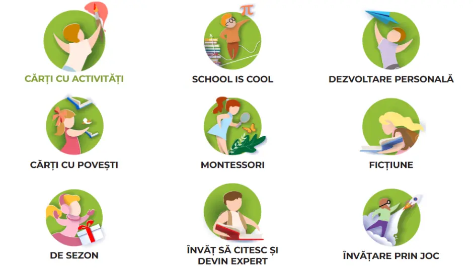 Colecții recomandate: titluri de ficțiune pentru copii, Descopăr științele de mic, IQ Fun, EduCard, dar și materiale Montessori adaptate pentru școlari.