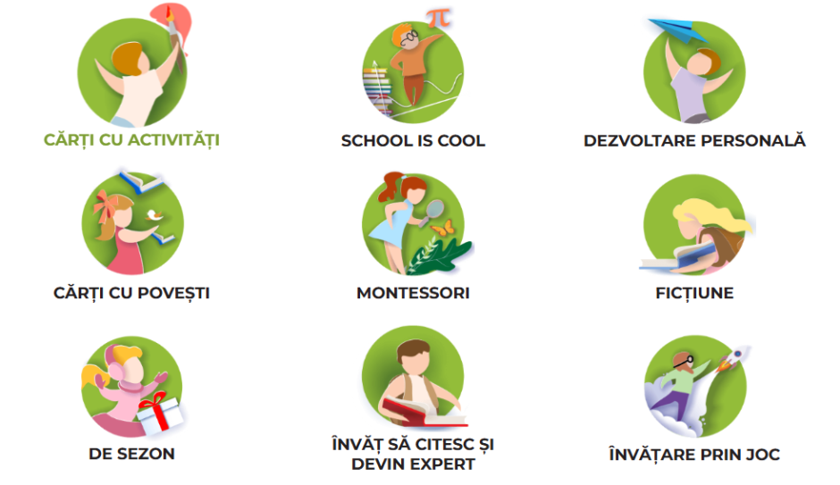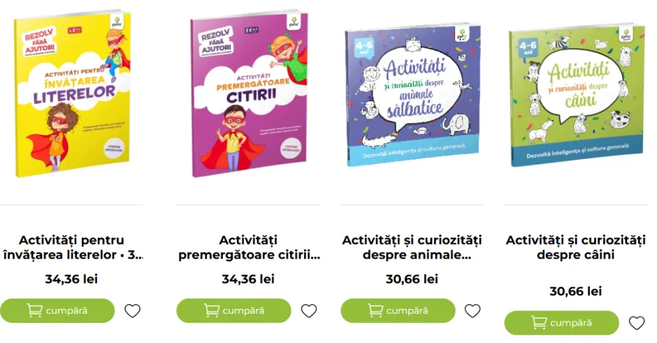 - cărțile educative și de activități – care introduc noțiuni simple de matematică (adunări ușoare), primele cuvinte în engleză sau concepte despre natură și știință;