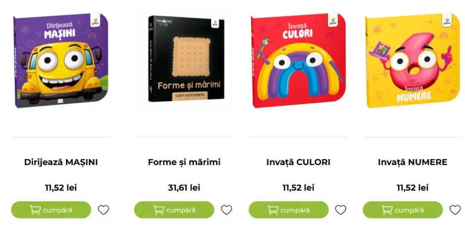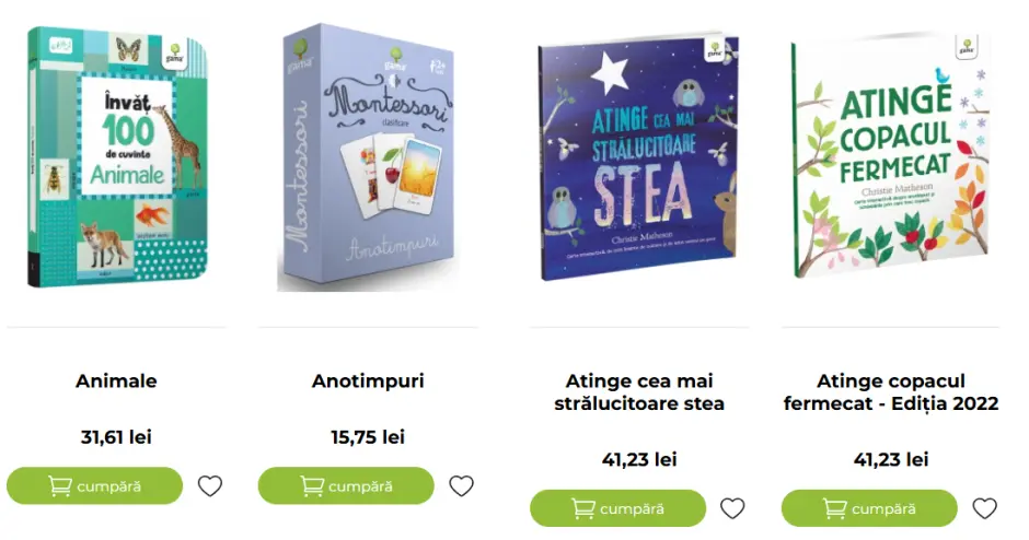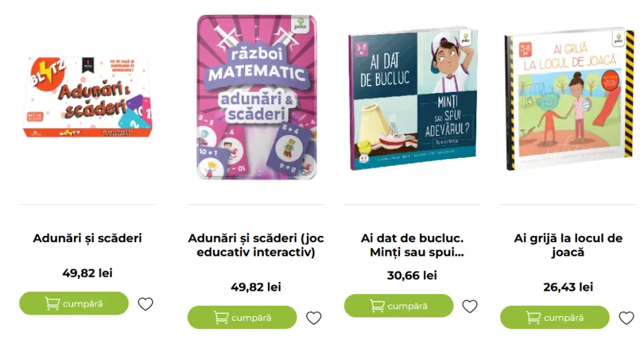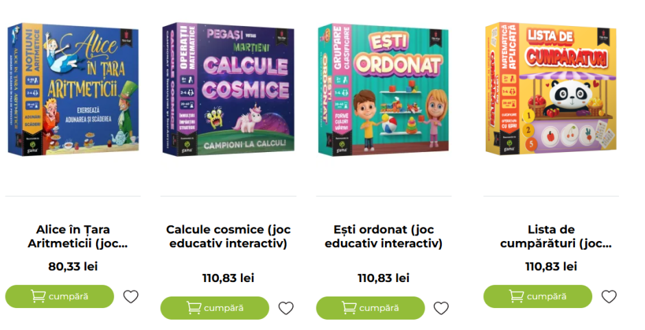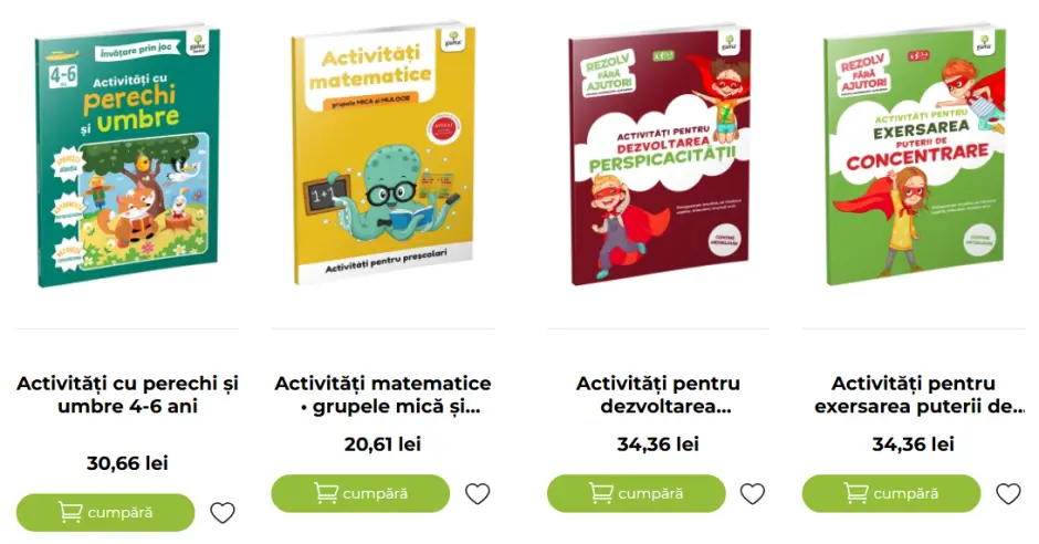 Colecții recomandate: Jocuri Montessori, EduCard, cărți cu povești, puzzle-uri interactive sau cărți de colorat tematice.