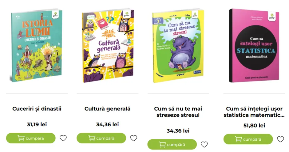 - cărți educative tematice – introduc noțiuni de știință, istorie sau cultură generală într-un mod prietenos.