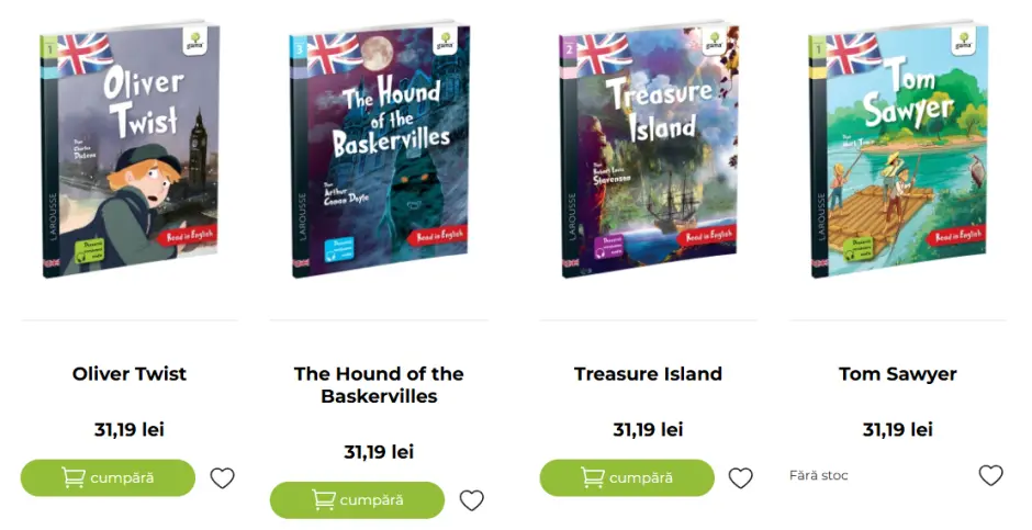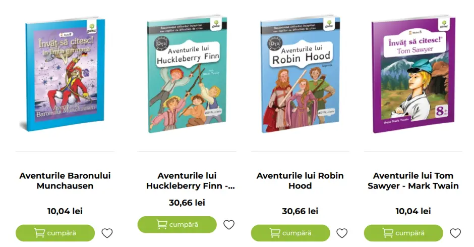 Exemplu de titluri: cărți de tip „eu citesc singur”, povești adaptate nivelului de școală primară, dar și materiale interactive care îi ajută să stăpânească materia școlară într-un mod jucăuș.